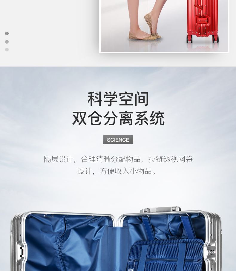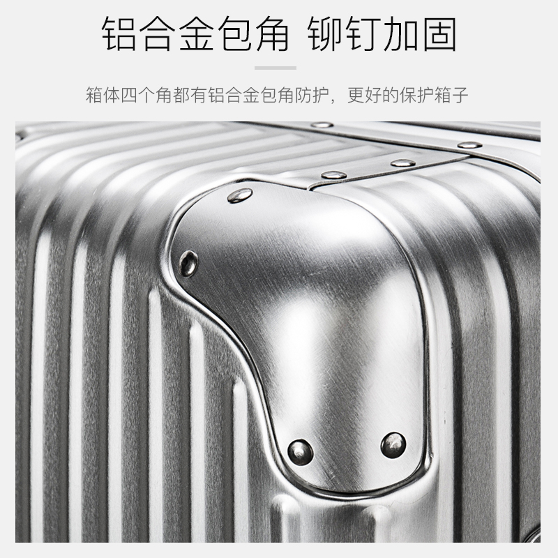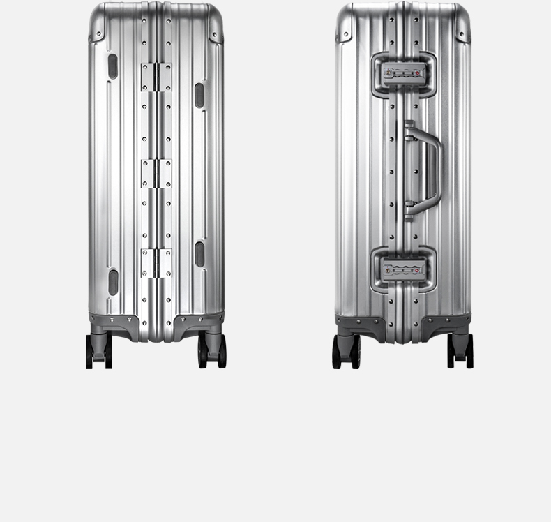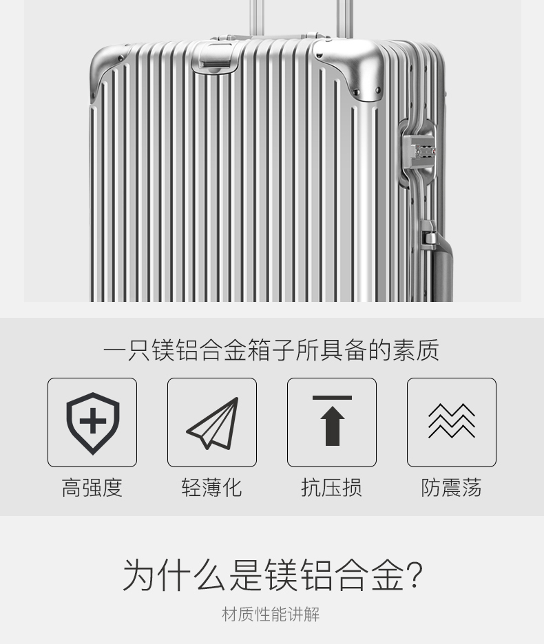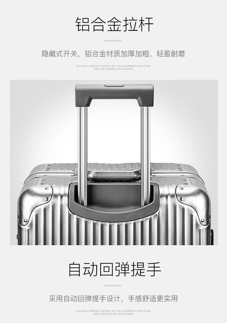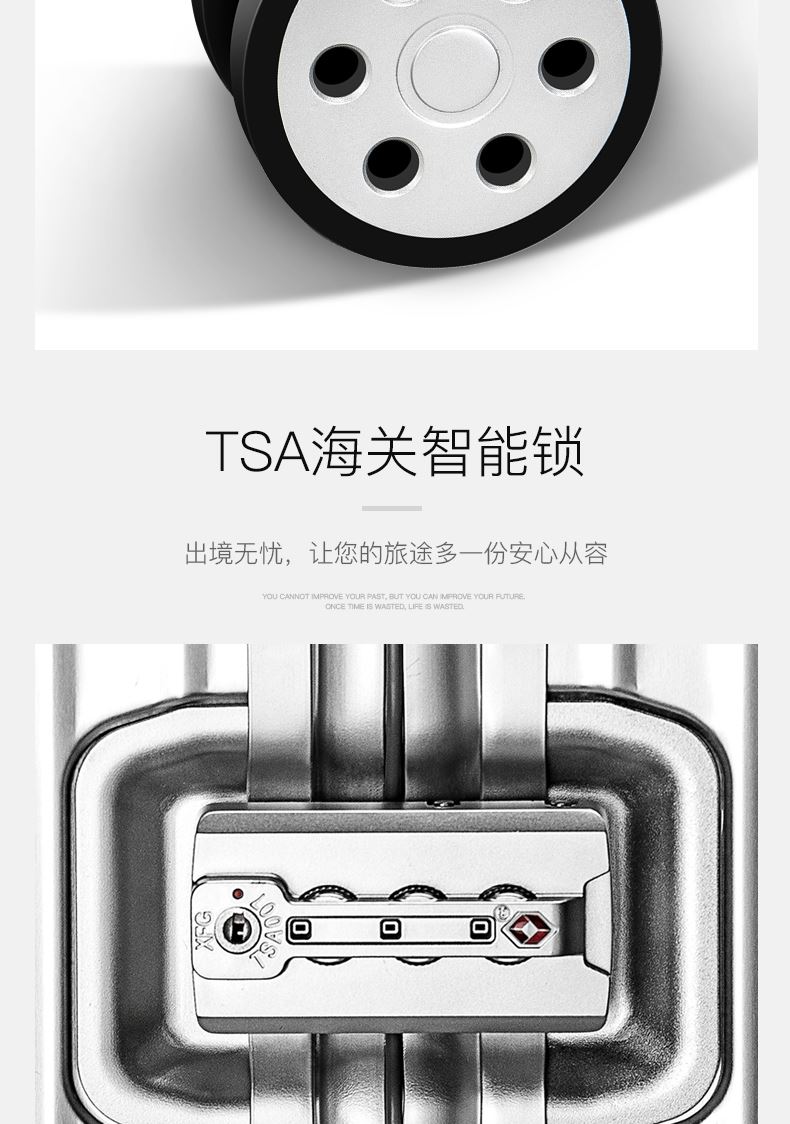 型 號:22001 尺 寸:20英寸 顏 色:銀色/黑色/紅色/鈦金色 采用耐磨靜音萬向輪,金屬軸心,堅固耐用,雙排靜音,國際通用TSA密碼鎖,箱框采用輕質(zhì)鋁合材質(zhì),密封性好,箱體面板采用高分子PC+ABS面板,強度高、韌性好,一次熱塑沖壓而成、從抗震性、厚度及耐沖擊力等特性均有顯著提升、航空介質(zhì)鋁合金拉桿質(zhì)量更輕盈、耐用性提高三倍