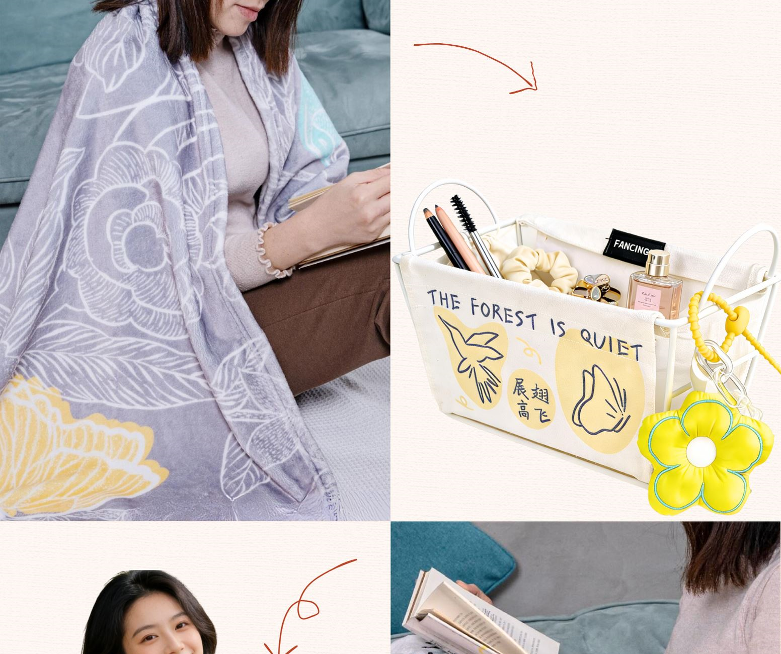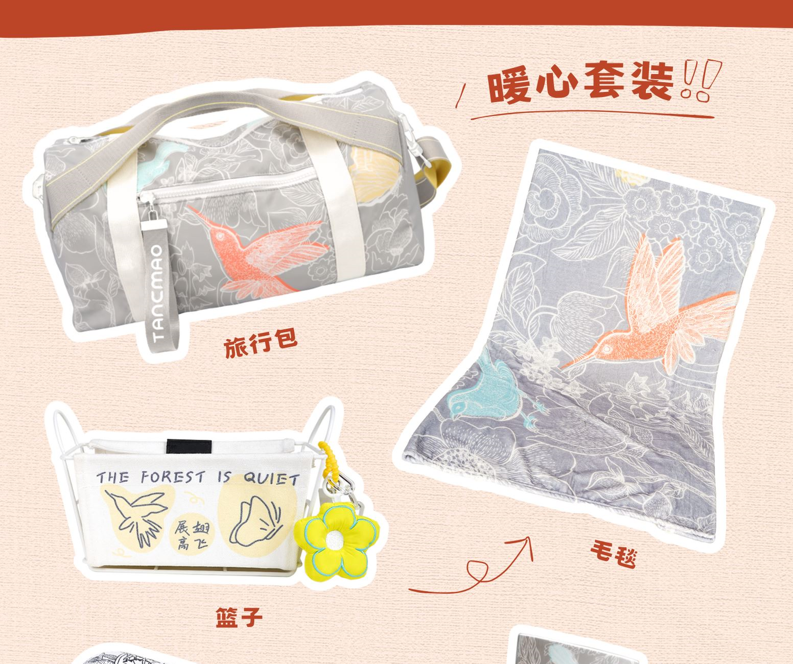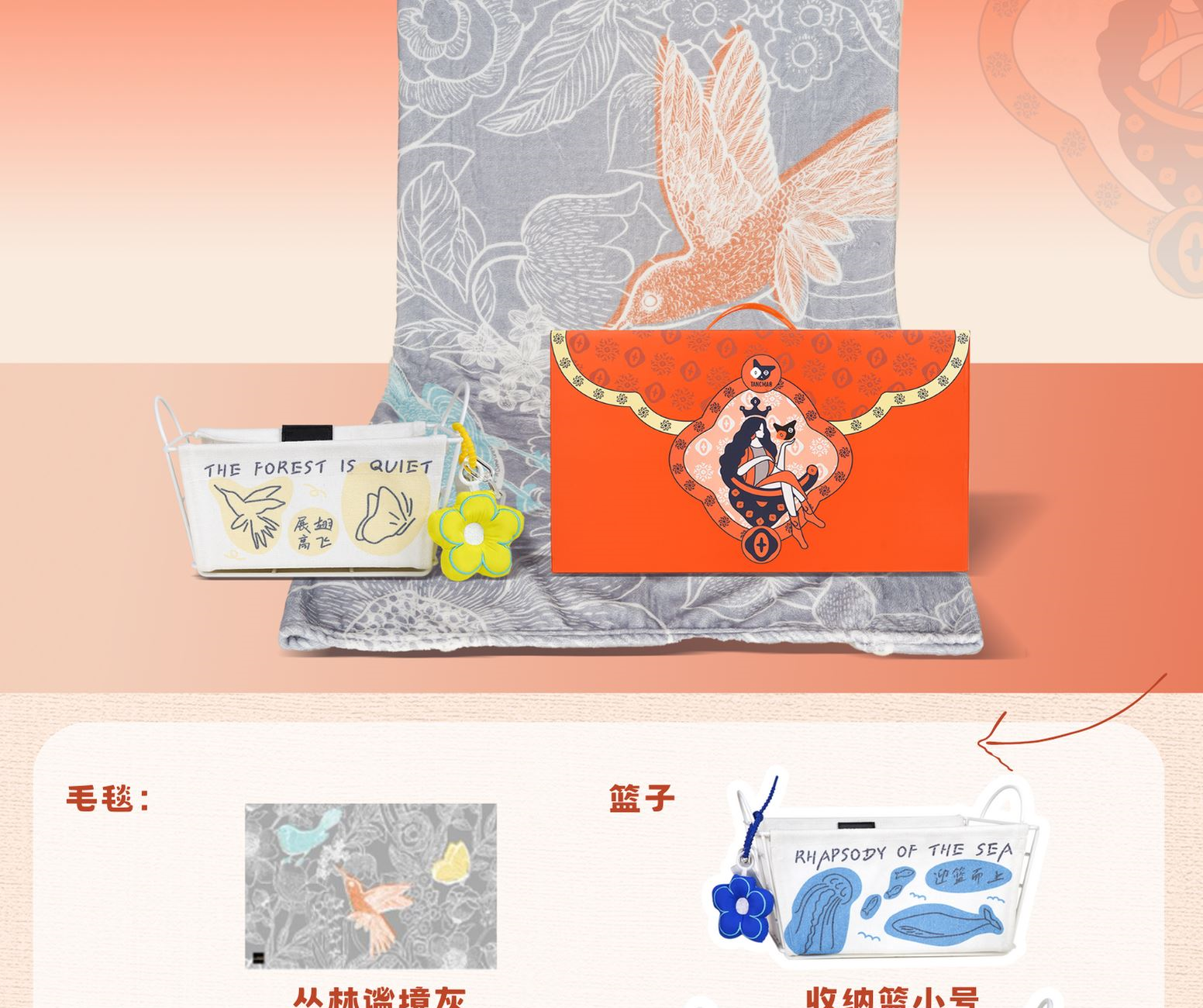 手提插口盒*1 小花掛件*1 藍(lán)/黃收納籃*1,海洋款/鳥蝶黃大/小兩型號(hào),小:245*120*95mm,大:300*140*130mm 毛毯*1,1500*1100mm(叢林灰/叢林藍(lán)/海洋彩)