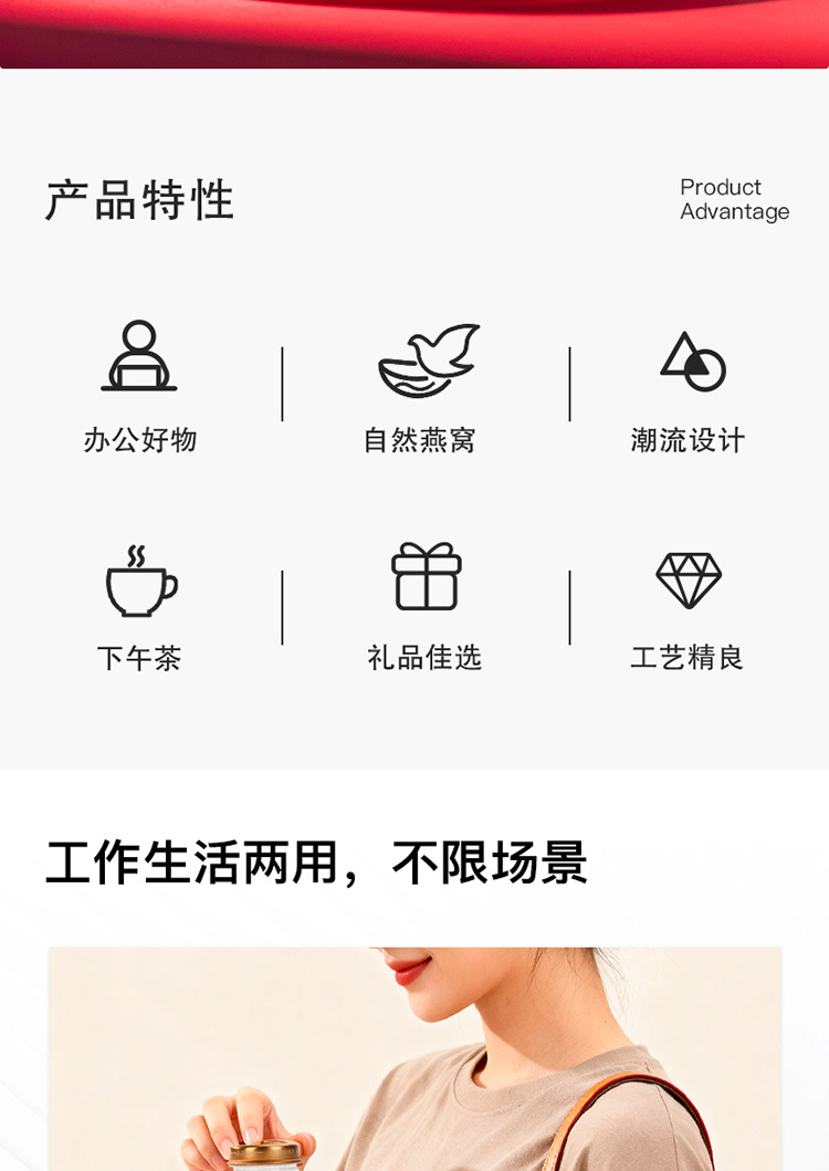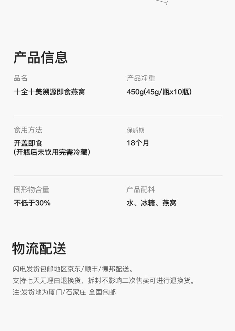 配置:10瓶/盒 固形物含量≥30% 凈含量:45克*10瓶 配料:純凈水、燕窩、冰糖 食用方法:開蓋即食, 建議晨起空腹和睡前半小時(shí)各飲用一瓶 產(chǎn)品特點(diǎn): 一瓶一碼,可溯源,國際檢測報(bào)告認(rèn)證 內(nèi)含十瓶燕窩,送禮大氣,顏值與品俱佳